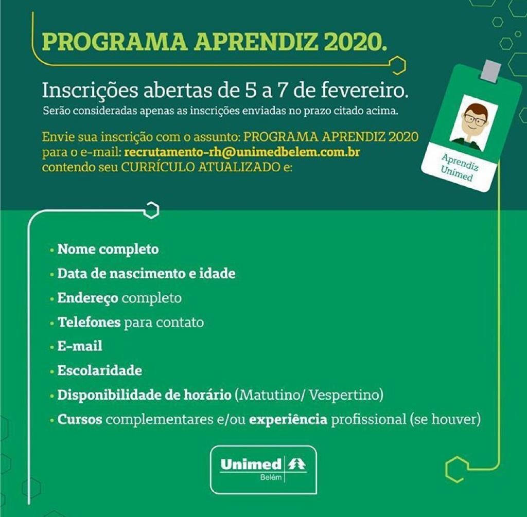 A cooperativa Unimed Belém está com inscrições abertas para o Programa Aprendiz Cooperativo, realizado em parceria com o SESCOOP/PA. Os interessados devem enviar currículo até a próxima sexta (07) para o e-mail: