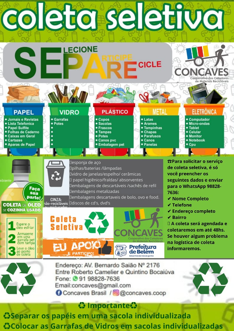 Para solicitar a coleta seletiva da CONCAVES, devem ser enviadas por WhatsApp para o número (91) 98828-7636, as seguintes informações: Nome completo, telefone, endereço completo e bairro. A coleta será feita pela cooperativa em até 48 horas após a solicitação.